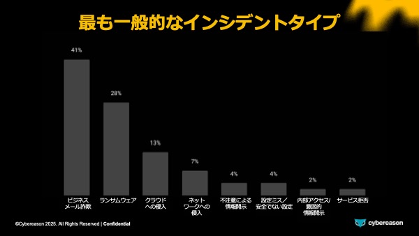 - ビジネスメール詐欺(BEC)が最も一般的な脅威インシデントタイプであり、これは観測された脅威インシデントのうち41%を占めました。