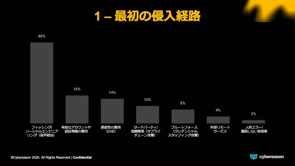 予想通り、フィッシングとソーシャルエンジニアリングが侵入経路の大半(46%)を占めており、次いで認証情報の悪用と脆弱性の悪用がこれに続く形となっています。