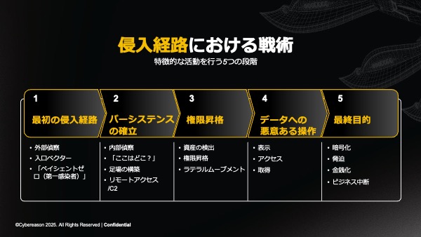 本レポートでは、侵入経路における5つの段階におけるデータを提供しています。これらの段階には、最初の侵入から、パーシステンスの確立、権限昇格、データ流出、マネタイズ戦術に至るまでが含まれます。注目すべき調査結果は以下の通りです。