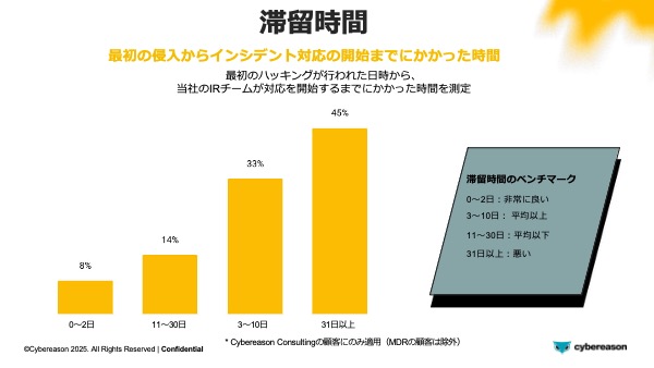 本レポートにおいて、私たちは、MDRの顧客を除外した上で、滞留時間を測定しました。滞留時間とは、最初のハッキングが行われた日時から、当社のIRチームが対応を開始するまでにかかった時間のことです。その結果、45%のケースで滞留時間が31日を超えていたことが判明しました。これは理想的な状態とは程遠いものです。