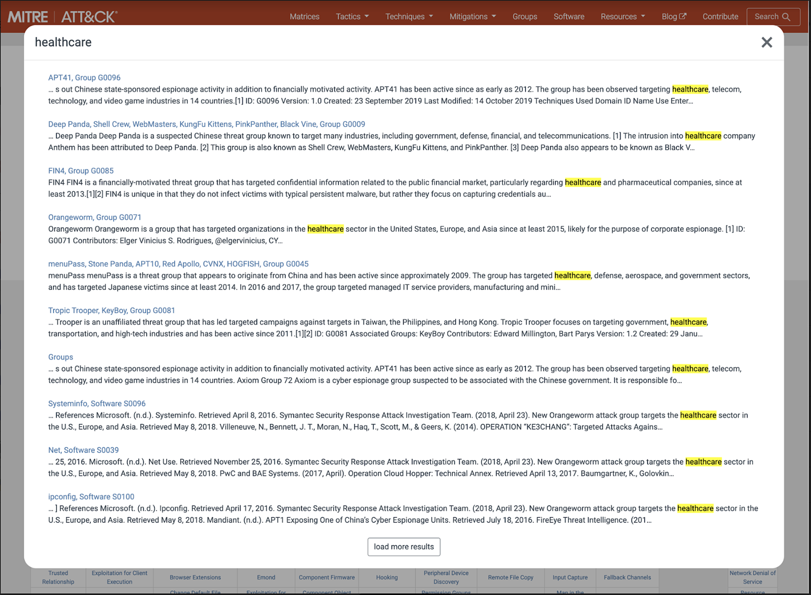 図3: MITRE ATT&CKのWebサイトで医療会社をターゲットにすることが知られている攻撃者グループを検索