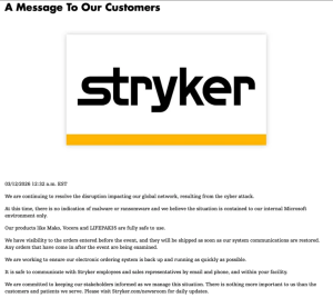 公開されている報告により、Stryker社が2026年3月11日に内部のMicrosoft環境に影響を及ぼすグローバルなサイバー攻撃を受けたこと、および同社が公開アップデートの時点でランサムウェアやマルウェアの兆候はないと述べたことが確認されています。Stryker社の声明によると、混乱は内部のMicrosoft環境に限定されており、復旧作業が進められる間、事業継続計画(BCP)が発動されました。