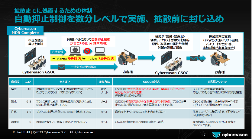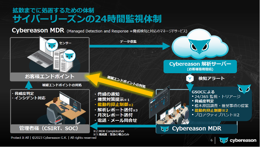 この場合は、先に封じ込めを行ったあとにお客様に通知し、その後、専門のアナリストが解析を行い、追加の調査結果をお届けする、2段階のサービスとなっています。