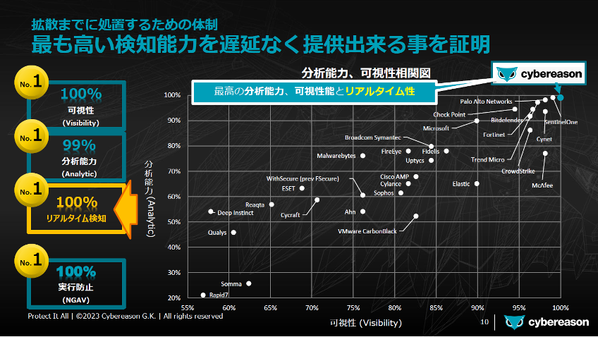 その結果ですが、サイバーリーズンEDRはリアルタイム検知において100%の結果を残しています。このリアルタイム検知とは、すべての検知において遅延がなかったことを証明しています。