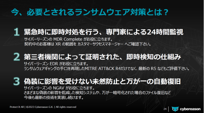 まずは、100%の未然防止が現実的ではない以上、緊急時に即時対処を行ってくれる専門家の、24時間監視が必要と考えています。これに関しては、Cybereason MDR Completeがお役に立ちます。