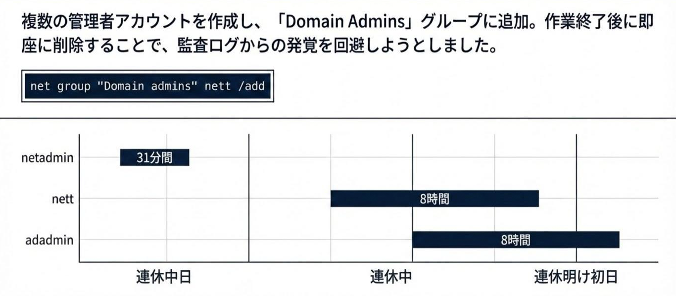 特筆すべきは、攻撃者が作成したアカウントは短時間で削除していることと、攻撃者が既存の管理者アカウントを削除したことです。