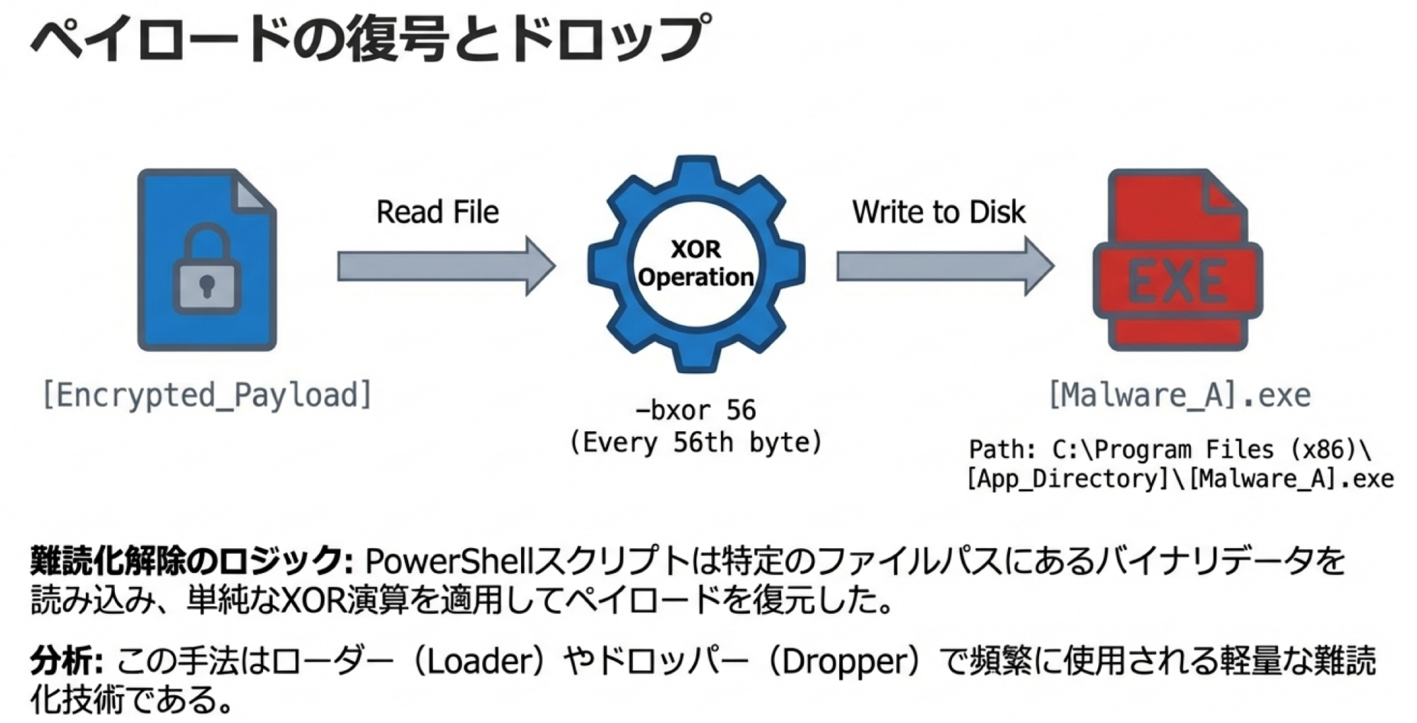 ここで使われた難読化技術を紹介します。攻撃者はpowershell.exeを悪用し、バイナリデータに対して56バイトごとにXOR演算(-bxor 56)を行うデコード処理を施して、ペイロードを復元しました。