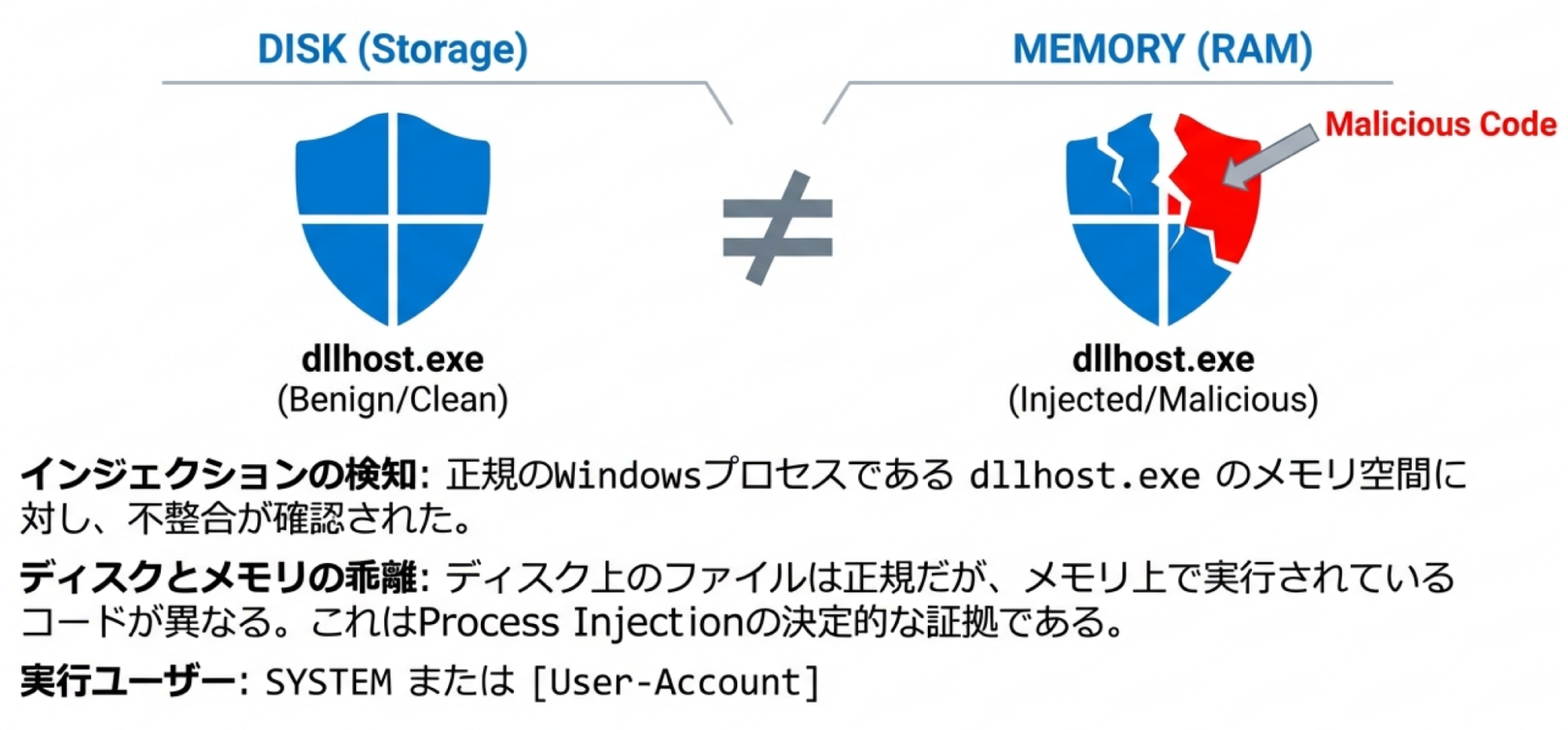 攻撃の舞台は、ディスクからメモリという見えない領域での武装化(マルウェアファイルの組み立て)へと移ります。私たちの解析では、正規プロセスであるdllhost.exeに悪意のあるコードを注入するプロセスインジェクションが確認されました。