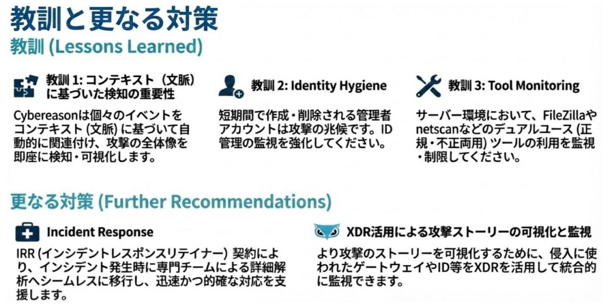 この実録が示す教訓は、「侵入を前提としたセキュリティ戦略」への転換こそが、もはや選択ではなく必須であるという事です。攻撃者は常に進化し、境界を越えて内部に潜伏します。巧妙な攻撃の兆候をいかに「素早く検知し、紐づけ」、そして必要な時に「専門家による迅速な初動対応」を得られるチーム作りができているか、今一度確認されてみてはいかがでしょうか。