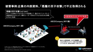 - ネットワーク攻撃:身近に潜む「あくまの双子」 リモートワークの普及に伴い、公共のWi-Fiを利用する機会が増えたことで被害が拡大しています。特に巧妙なのが「あくまの双子(Evil Twin)攻撃」です。これは正規のアクセスポイントを偽装し、ユーザーを偽のWi-Fiルーターに接続させて通信内容を傍受する手法です。Wi-Fiの名称は任意に設定できるため、攻撃者は本物そっくりの偽ポイントを簡単に構築できてしまいます。