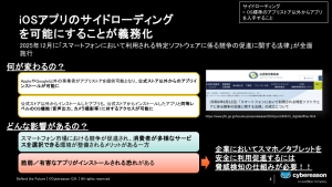 - 「スマホソフトウェア競争促進法」によるリスク増大: 2025年12月に施行されたこの法律により、公式ストア以外からもアプリのインストールが可能になります。利便性は向上しますが、審査の行き届かない有害なアプリが紛れ込むリスクも高まります。企業は「どのアプリを許可するか」という明確なルールと、それをチェックする仕組みを整えなければなりません。