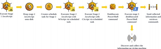 ステージ1のペイロードの実行は、Windows Script Hostプロセスであるwscriptを介して行われます。実行時に、マルウェアは第2ステージのペイロード(これもまたサイズの大きな難読化されたJavaScriptファイルです)をディスク上にドロップした後、同ペイロードを実行するスケジュールタスクを登録します。この時点で、第1ステージのペイロードの実行は終了します。続いて、第2ステージのペイロードがスケジュールタスクを通じて直ちに実行されます。