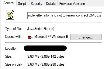 初期感染ファイルは難読化されたJavaScriptファイルです。ファイル名は、通常、法律や契約関連の文書に関連付けられたものであり、末尾にIDが付加されます。インターネット上で確認されたファイル名の例を下記に示します。