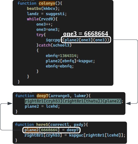 また、脅威アクターは関数をオブジェクトとして配列内に配置することで、実行フローを難読化します。この手法により、脅威アクターは、実行時に配列のインデックスを呼び出すことで特定の関数を呼び出せるようになるため、防御者による実行フローの分析を妨げることができます。