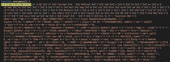 ステージ2のGootLoaderペイロードは、同じコードを連結することでコードサイズを水増しします。これは、おそらくアンチ分析手法の一部だと思われます。難読化方法はステージ1と似ており、セグメント化された難読化コードを散りばめることで、それ自身を難読化します。ステージ2がセグメント化されたコード/文字列を連結して難読化解除を行うと、実行フローは難読化解除された関数(これは配列内に格納されているオブジェクトです)に入ります。