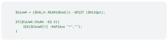 C2は、指定された区切り文字を含む文字列を連結した応答を被害者の端末へと送信します。この区切り文字は、関数の先頭にハードコーディングされています。文字列が、この区切り文字を使って配列へと分割されると、この配列内にある2番目のインデックスが実行されます。