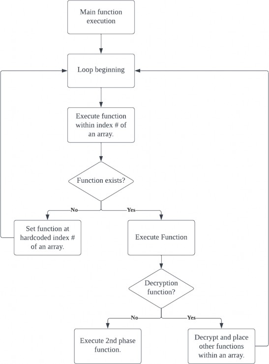 ステージ1は、必要な関数をすべて含むmain配列で構成されており、コードはwhileループを通して各関数を実行します。文字列/コードの難読化が完了すると、配列内のmain関数が実行されます。この関数は、さらにもう1つの文字列/コードを難読化解除します。この難読化解除されたコードが、ステージ2を実行することになります。