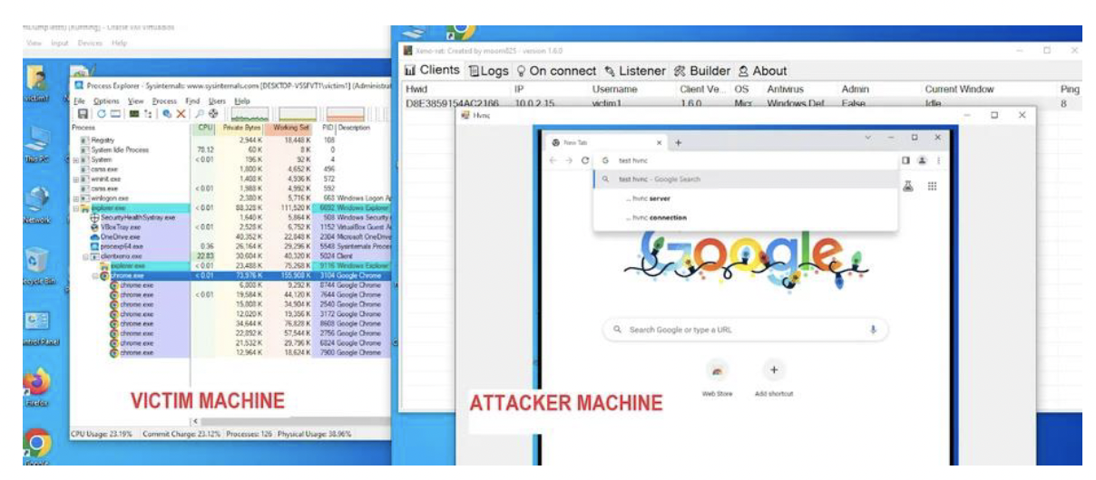 Xeno RATが被害者ホスト上に導入されると、下記のスクリーンショットに示すように、hVNCを通じて攻撃者マシン上でオープンされたGoogle Chromeが、被害者マシンでは不可視の状態になることが確認できます。