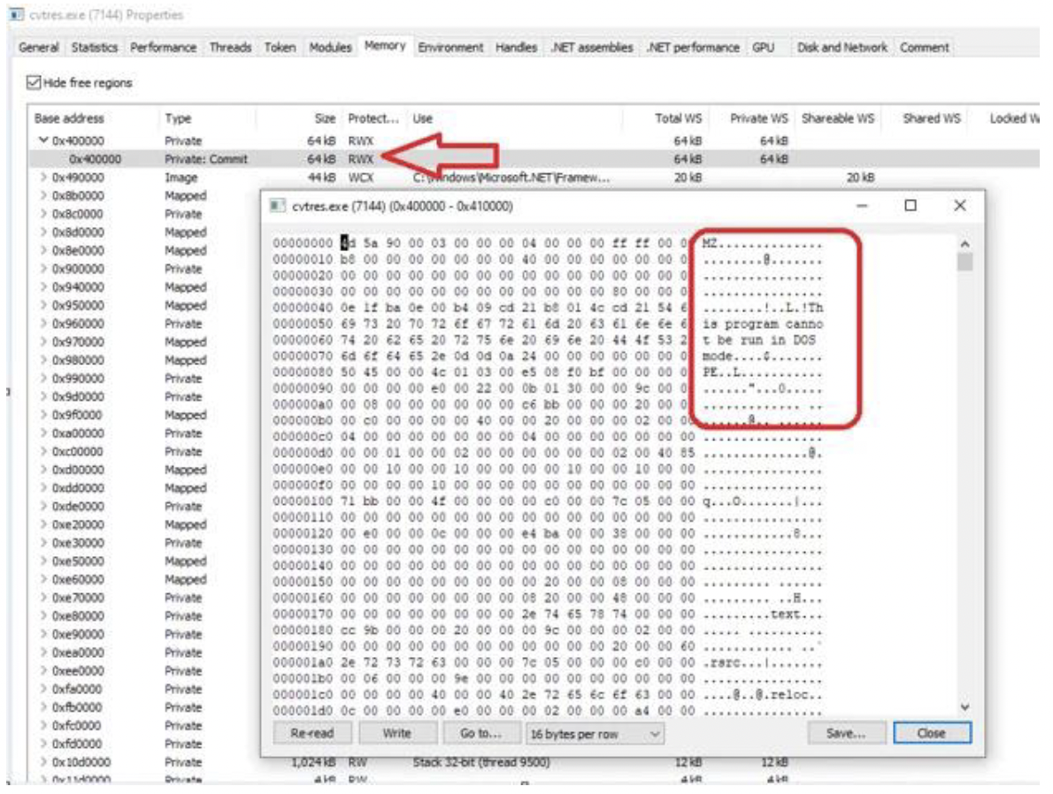 この例では、攻撃者は正規のプロセスcvtres.exeを利用してコードをインジェクトしていることが確認されました。