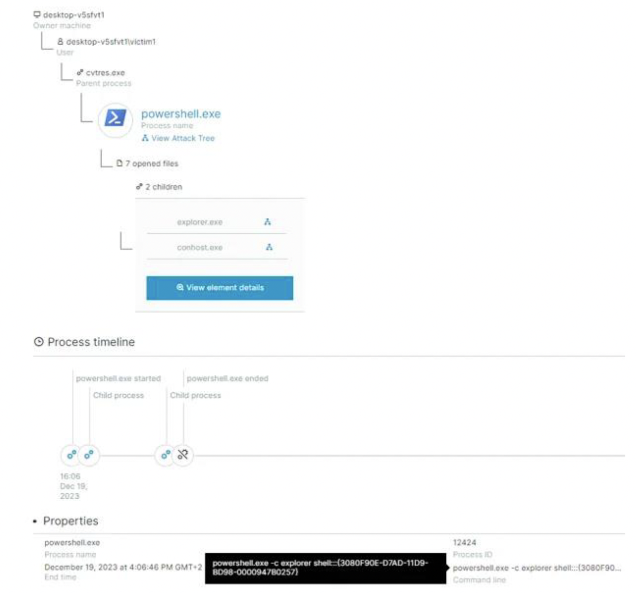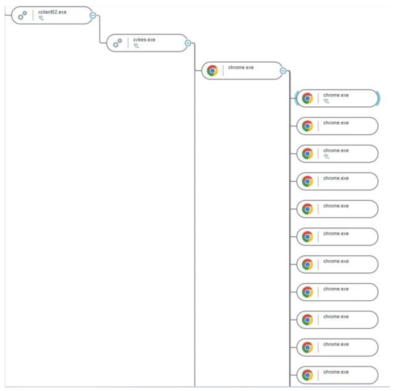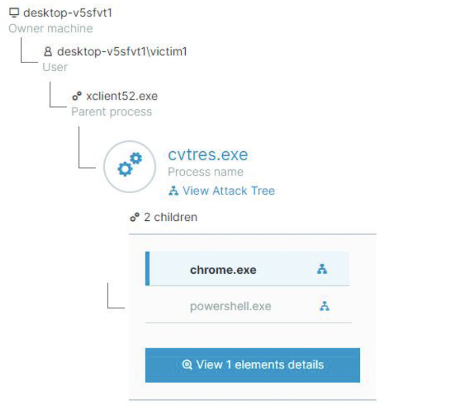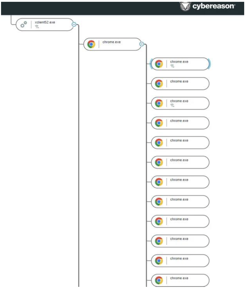 Cybereason Defense Platformの攻撃ツリーには、xclient52.exe(XWorm)がcvtres.exeを生成した後、powershell.exeとchrome.exeを生成したことが示されています。これらのプロセスは、被害者のデスクトップからは不可視となります。