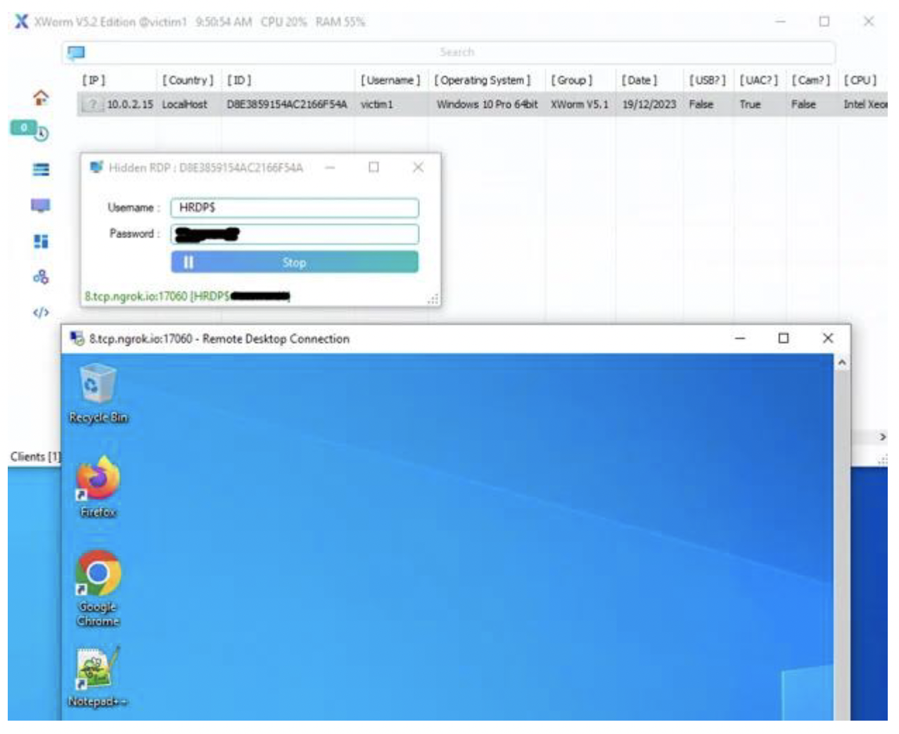 最後に、私たちはXWormのhRDP機能を分析し、隠れたRDP接続が成功していることを示しました(下図参照)。