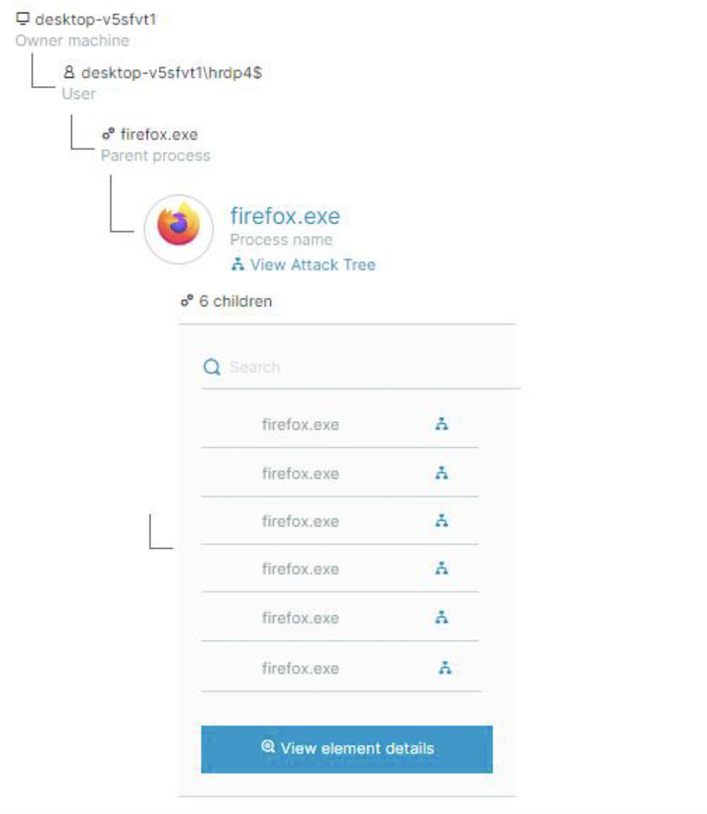 この結果として生成されるプロセスツリーを見ると、別のユーザーであるHRDP4$が、この作成されたFirefoxプロセスの所有者となっていることが分かります。この新しいユーザーは、被害者とは異なるリモート接続セッションを使用するために作成されるものであり、これにより視覚的な異常を回避できます。