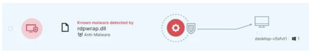さらに、Cybereason Defense Platformを使うと、hVNC/hRDP機能を使用したRATに関連する攻撃において観測されるポストエクスプロイテーションを検知して防御できます。下記の例では、同時リモートデスクトップをサポートするためにrdpwrap.dll使用されています。