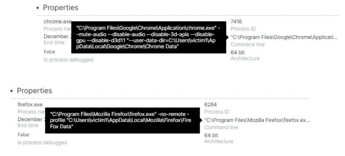 隠しブラウザを起動する(Firefoxでは-no-remote-profile、Chromeでは–disable-gpuという通常使われないフラグが使用される)際に、XWormが生成するコマンドラインの例を下記に示します。