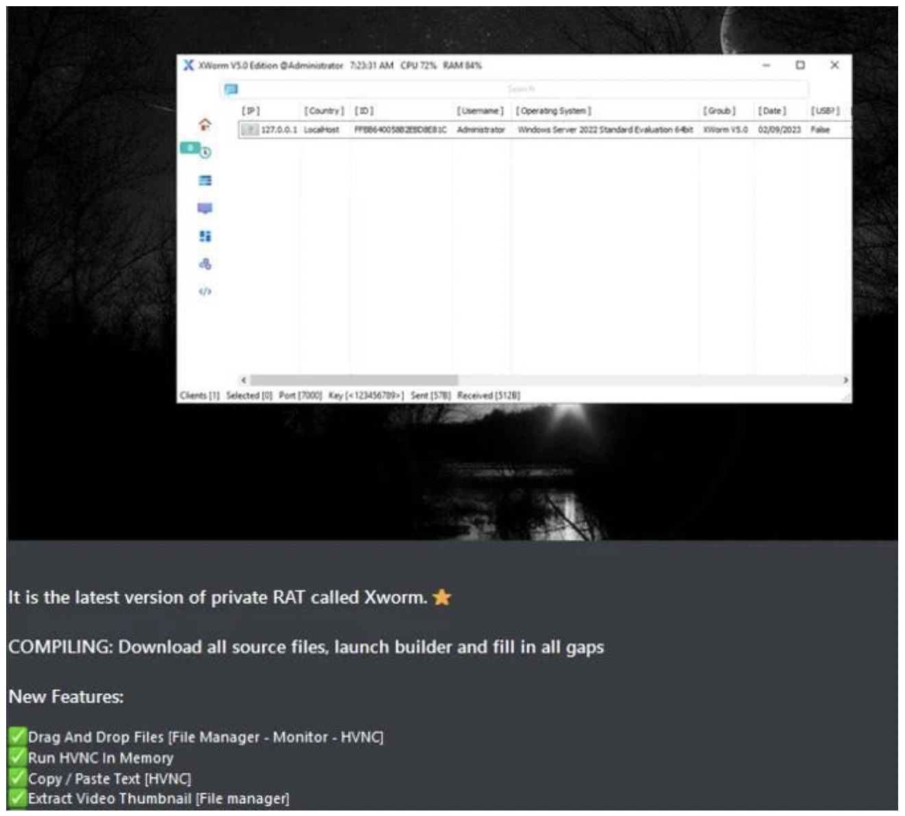 ▲マルウェアフォーラムで紹介されたhVNC機能とhRDP機能を持つXWorm RATの例
