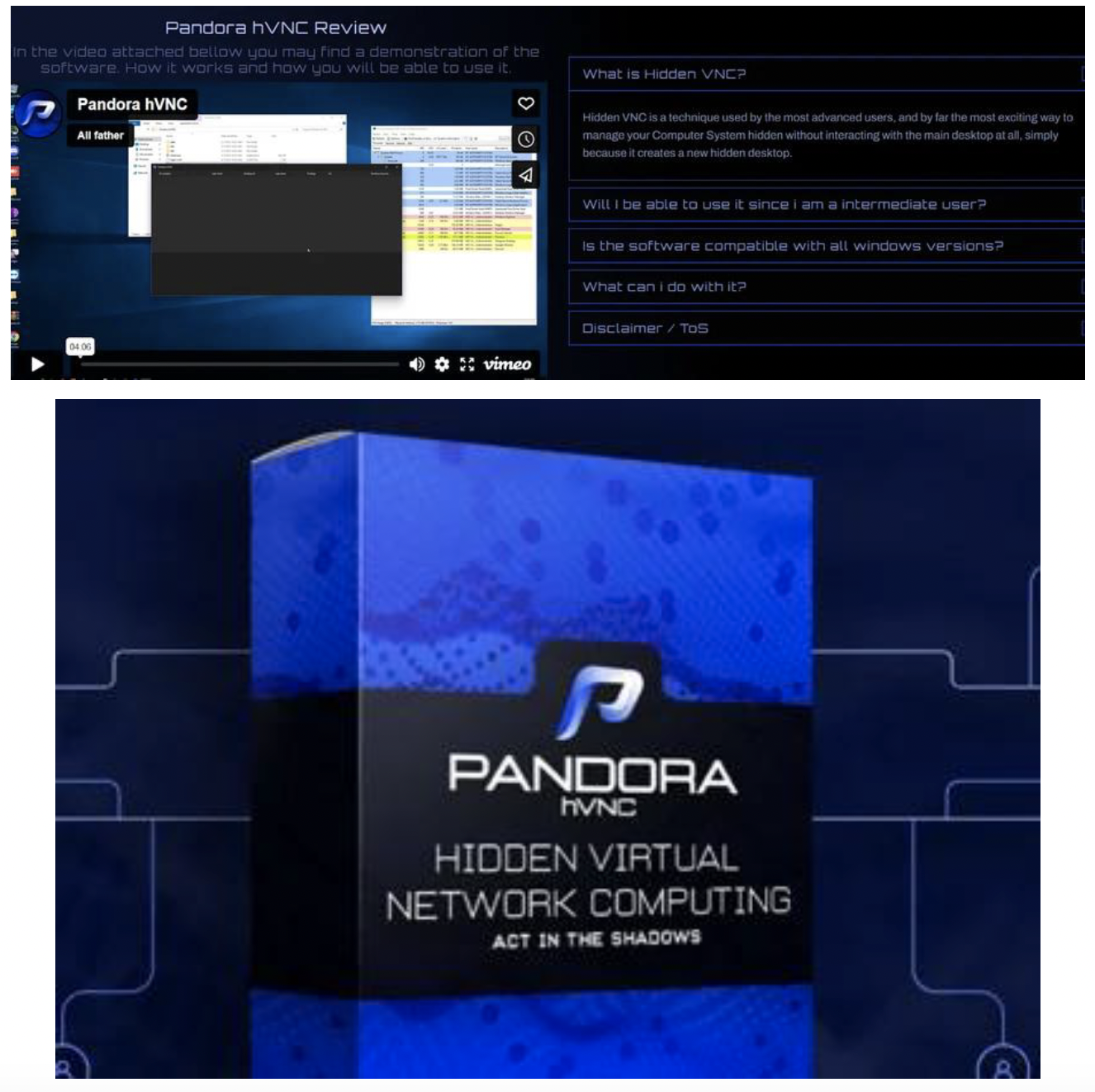 Pandora hVNCは、2021年以来サイバー犯罪フォーラムで出回っているRATであり、秘密裏にシステムを制御できることが理由で、脅威アクターの間で好まれているツールとして定評があります。Pandora hVNCは、Venom RATと同様に、正規のリモートアクセスソフトウェアを装って販売されています。しかし、Pandora hVNCが持つ機能は、その悪意ある意図を裏切るものとなっています。