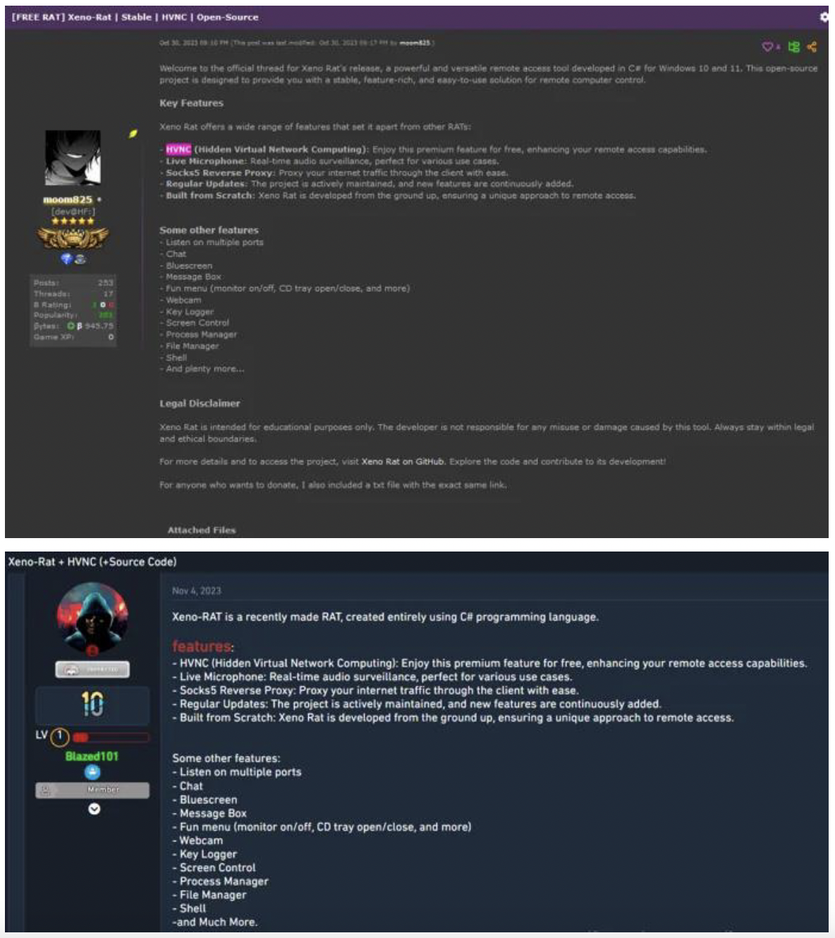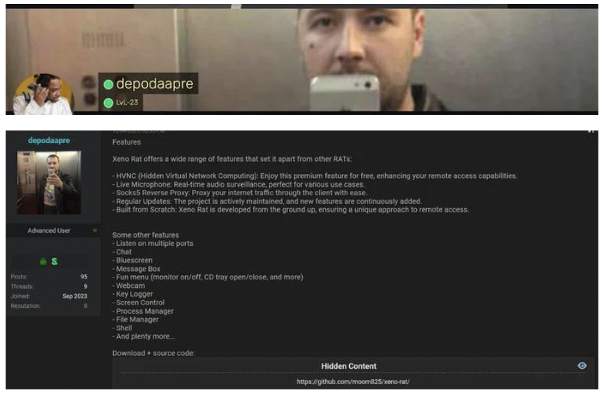 サイバー犯罪のエコシステムは、マルウェアフォーラムやダークウェブマーケットプレイスを介して、高度なツールやサービスが取り引きされるためのハブとして機能しています。このようなフォーラムの画面キャプチャを見ると、hRDP拡張ツールやXeno RATのようなマルウェアのリストがあることが分かります。これは、そのような機能が広く入手可能であり、かつ需要があることを示しています。