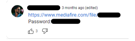 クラックされたソフトウェアのダウンロードリンクにアクセスできると主張する動画のコメント内のリンクをたどると、被害者はあるYoutubeのポストへとナビゲートされます。そのポストには、ファイルホスティングサービスであるMediaFireへのリンクと、そこでダウンロードできるzipファイルを開くためのパスワードが記載されています。