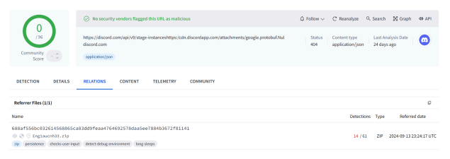 私たちは、Discordのアプリケーションプログラミングインターフェイス(API)が、悪意あるファイル(Eng1aucnh33.zip)を拡散するためや、LummaStealerのC2ドメイン(例:compleenykso[.]shop)への接続を確立するために使用されていることを発見しました。