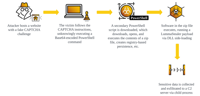 ▲偽のCAPTCHAチャレンジから始まるLummaStealer感染フローの例