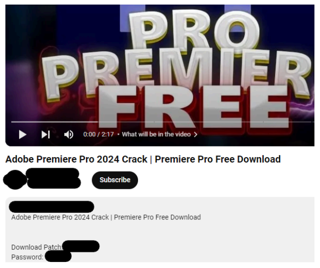 先述したように、LummaStealerのバイナリは、正規の有料ソフトウェアのクラック版にアクセスできると主張するポストを通じて、ソーシャルメディアサイトで拡散されています。Cybereason Global SOCが確認したケースでは、ある脅威アクターがハッキングされたアカウントを利用して、人気のビデオ編集ソフトであるAdobe Premiereのクラック版を宣伝するポストを作成していました。