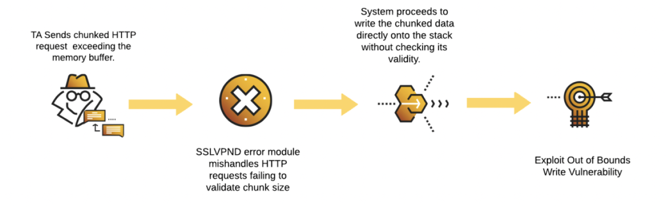 SSLVPNDエラーモジュールに脆弱性が発見されました。この脆弱性を悪用する場合、攻撃者は「/remote/invalidpage 」にHTTPリクエストを送信することで、この関数をトリガします。このHTTPリクエストは、「Transfer-Encoding:chunked」というヘッダを持ちます。このヘッダの後には、読み込むバイト数を決定するためのチャンク長が続きます。攻撃者は、境界外書き込みの脆弱性をトリガするために長いサイズのフィールドを送信します。SSLVPNDエラーモジュールのコードは、データをスタックに書き込む前にチャンクのサイズをチェックしません。メモリスタックに書き込むことで、攻撃者は、システムコールにアクセスしてリモートコード実行を実現できます。