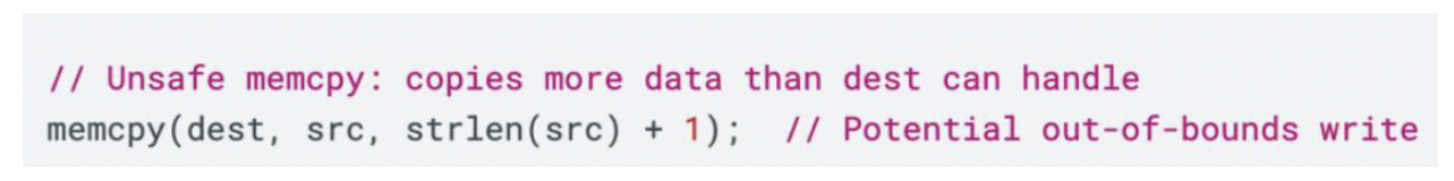 境界外書き込み(Out-of-Bounds Write)の脆弱性は、プログラムが割り当てられたメモリ境界の外側にデータを書き込むことで発生するものであり、これは予期せぬ動作やクラッシュ、セキュリティリスクにつながる可能性があります。この脆弱性は、アプリケーションがメモリバッファを不適切に管理し、隣接するメモリロケーションを上書きしてしまうことで発生します。C言語において、この種の脆弱性を引き起こす主な関数としては、strcpy()、gets()、memcpy()、sprintf()が挙げられます。