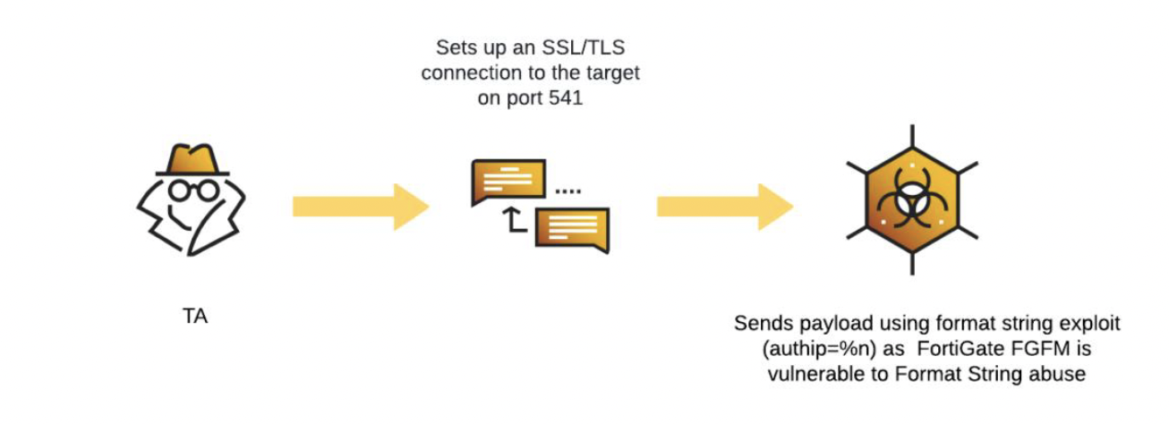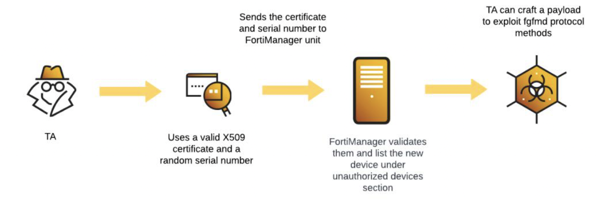 攻撃者は、物理的なFortiGateデバイスから証明書とシリアル番号を抽出します。有効なX509証明書/シリアル番号を持つ攻撃者は、FortiManagerユニットに悪意あるリクエスト(Get Authリクエスト)を送信することで、不正なFortiGateデバイスをFortiManagerに登録します。