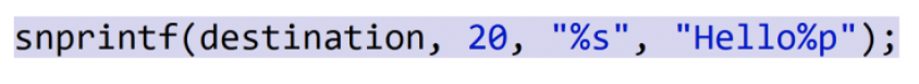 上記のコードが脆弱である理由は、それがフォーマット指定子を含んでいないからです。この場合、データは特定のフォーマットに変換されません。入力文字列に他のフォーマット指定子を追加することで、メモリアドレスをリークすることや、バッファサイズによってはバッファをオーバーフローさせることが可能となります。