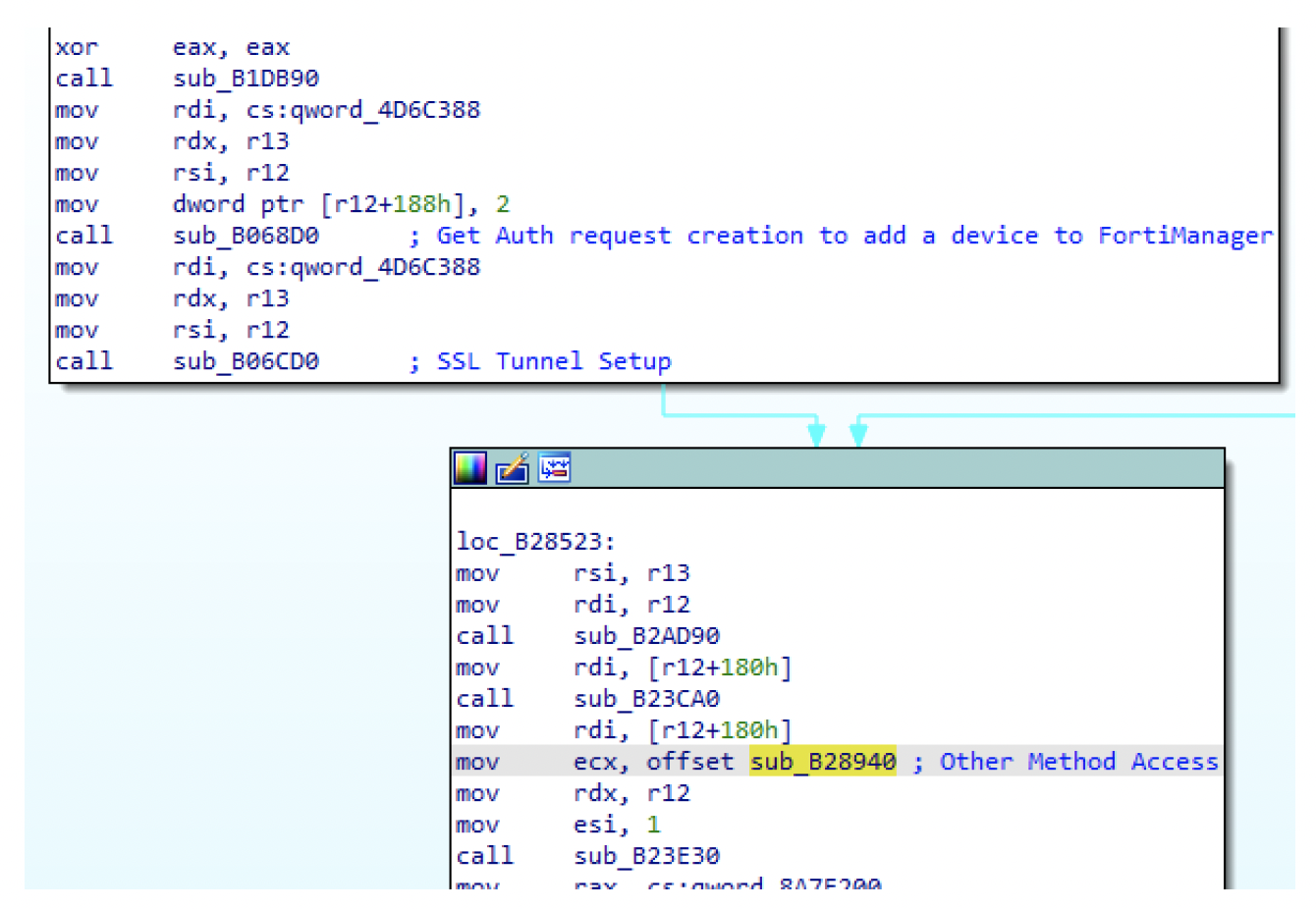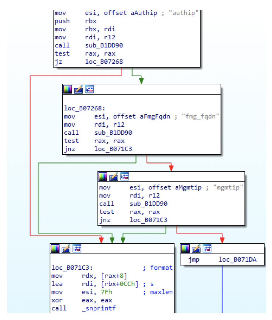 上記の両方の条件が満たされた場合、私たちは脆弱なコード関数に到達します。下記のコードブロックに基づくならば、authip、fmg_fqdn、mgmtipパラメータを使うことで脆弱なコードブロックに到達できると推測できます。