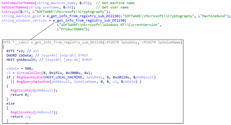 続いて、このランサムウェアは、感染した端末に関する情報を抽出します。まず、同ランサムウェアは、APIコールのGetComputerNameWとGetUserNameWを使用して、コンピューター名とユーザー名を収集します。