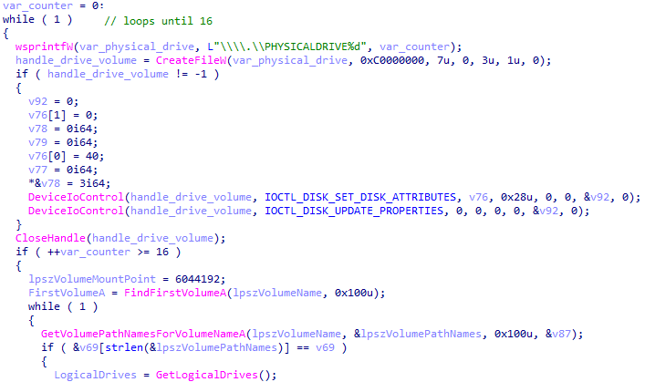 続いて、Ragnar Lockerは、ホスト上の既存のファイルボリュームを識別しようとします。これには、WindowsのAPIコールCreateFileWを使用して次のことを実行します。