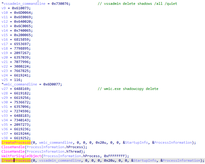 • wmic.exe shadowcopy delete:このシステムコマンドは、被害者のシステム上のすべてのシャドウコピーを削除し、被害者によるデータ復旧を阻止します。