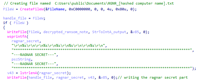 最終的に、Ragnar LockerはCreateFileWを呼び出し、要求されたテキストファイルを必要なパスで作成します。続いて、このパスに復号された身代金要求書を出力します。