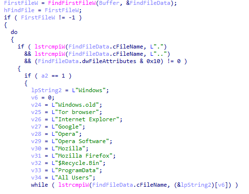 身代金要求書を作成した後、実際のファイル暗号化プロセスが実行されます。まず、Ragnar Lockerは、ドライブ(DRIVE_CDROMを除く)とディレクトリを取得し、暗号化対象となるファイルの文字列を暗号化関数に送ります。