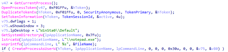 4. この昇格したトークンを使ってCreateProcessAsUserWを実行する