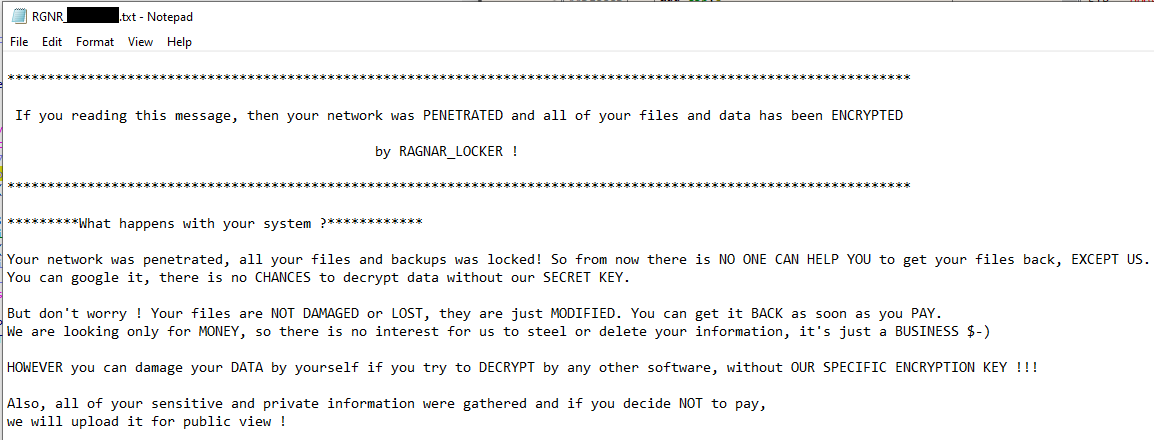 プロセスツリーを見れば分かるように、Ragnar Lockerランサムウェアの実行から数秒後に、同ランサムウェアは被害者の名前が設定された「RGNR_AABBCCDD.txt」という身代金要求書をドロップした後、メモ帳を使ってこのファイルを開きます。