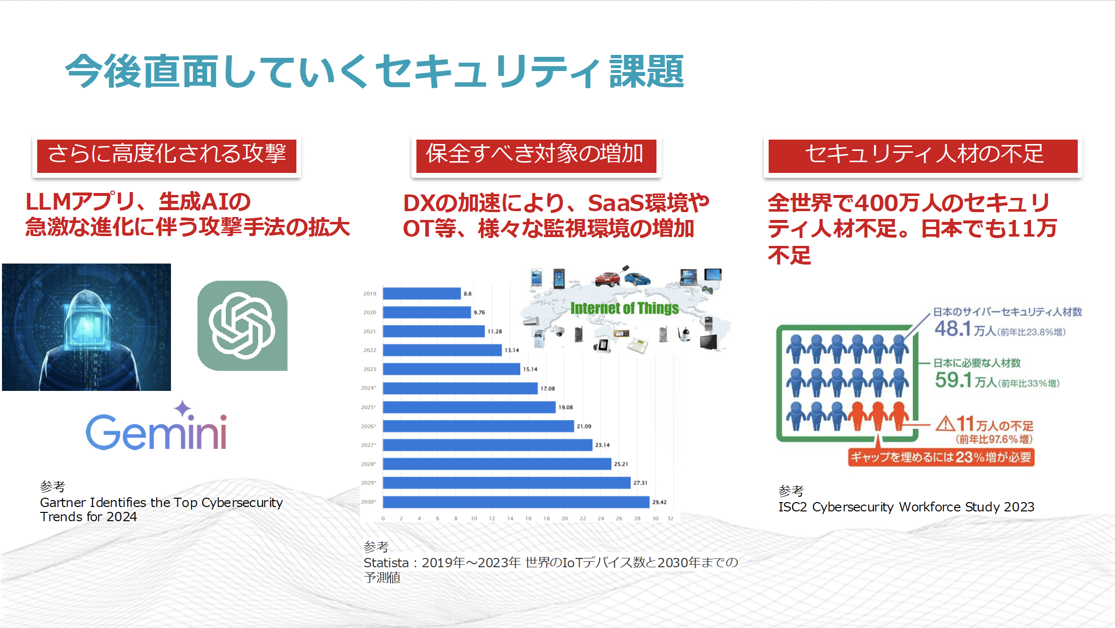 加えて、セキュリティ人材不足の問題は一向に解決の糸口を見いだせず、世界中で400万人もの人材が不足していると言われています。