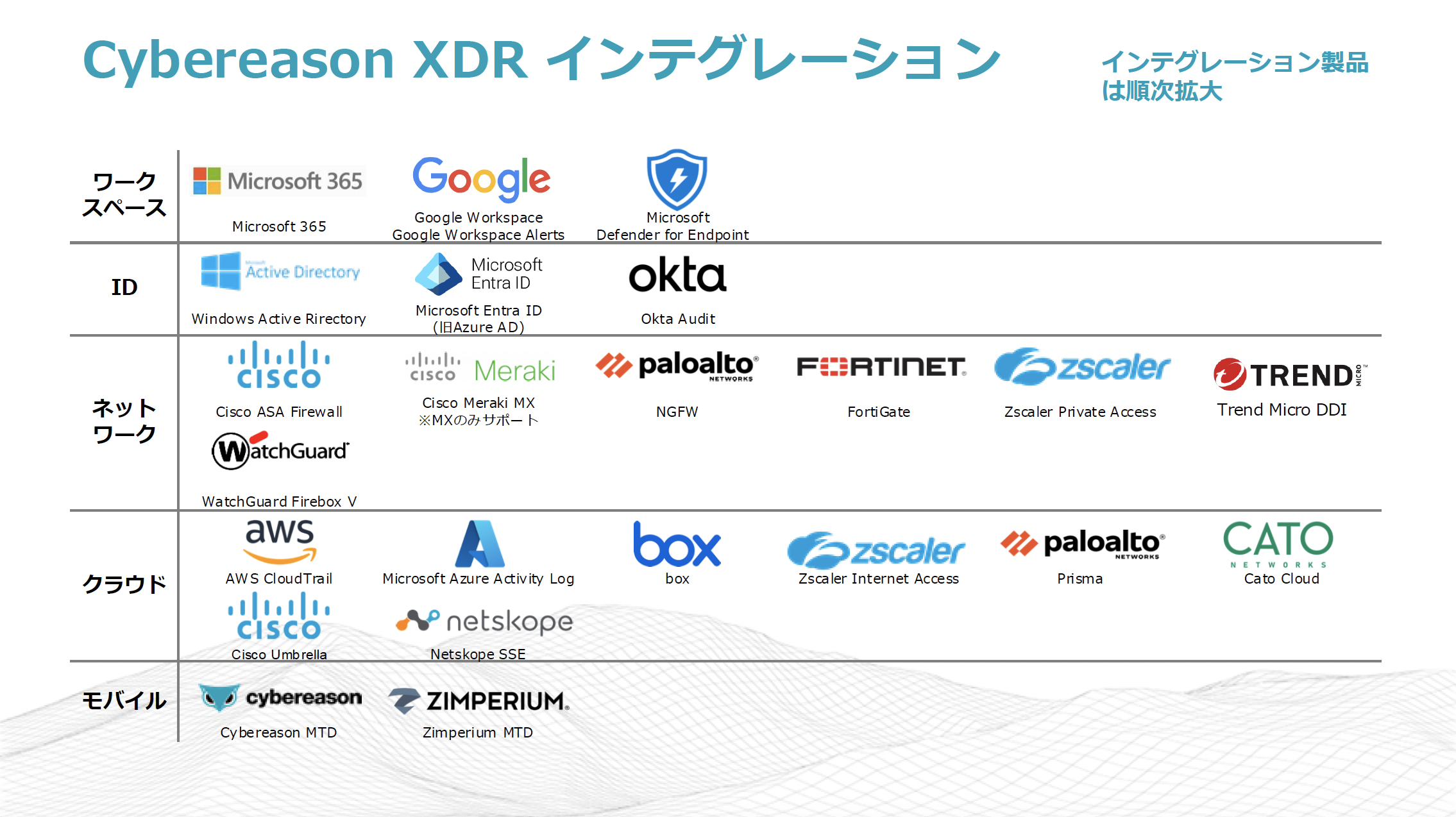 またXDR製品の中には、単一ベンダーの製品のみを監視対象とするものもありますが、Cybereason XDRはサードパーティ製のさまざまな製品を監視対象とすることができます。例えばワークスペース製品としてはMicrosoft 365やGoogle Workspaceを、ID管理製品としてはActive Directoryやoktaを、さらにはネットワーク製品としてはCiscoやFortiGate、Zscalerなどさまざまなベンダーの製品から広くログを収集することができます。