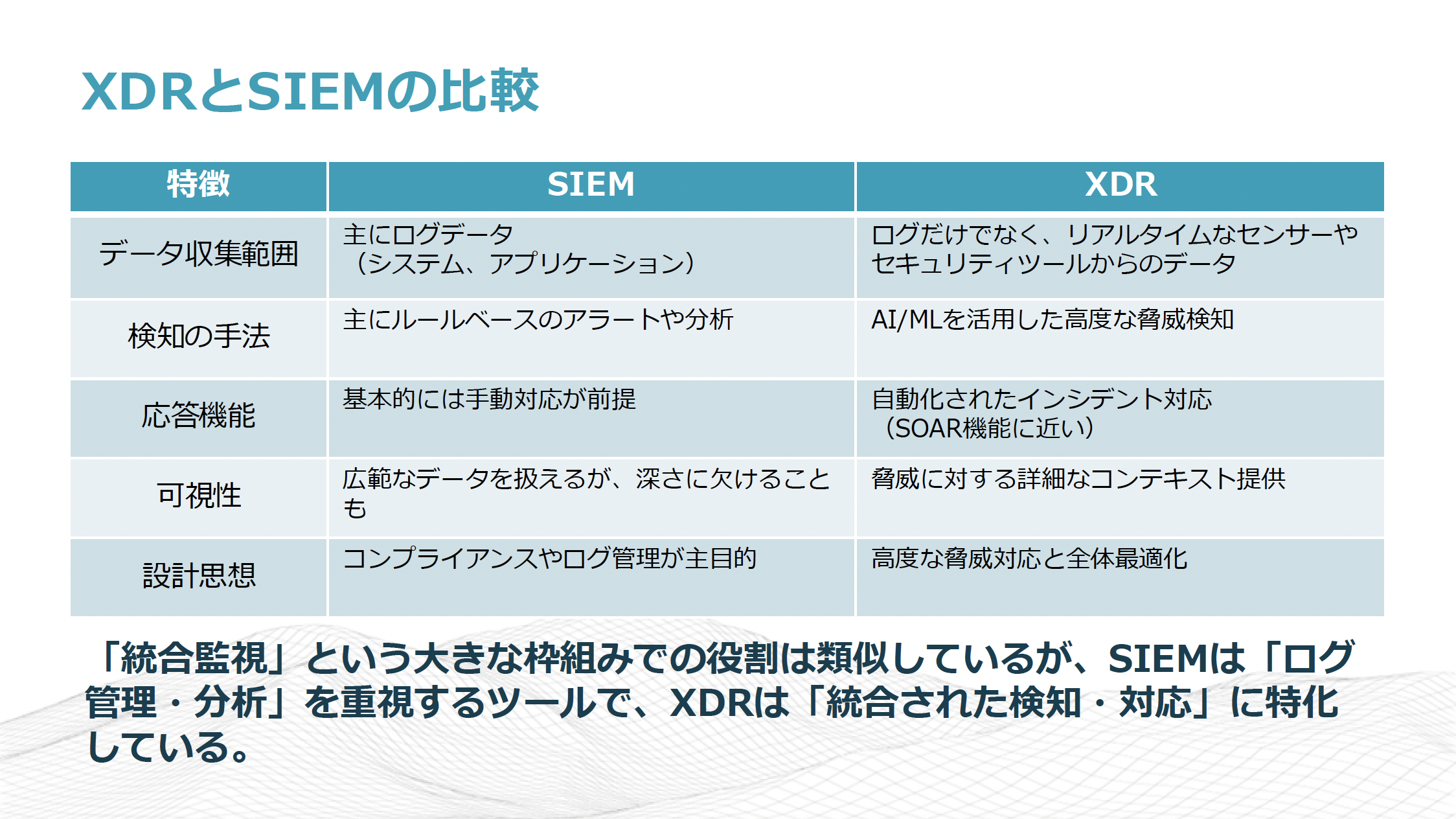 なお、XDRと類似するソリューションとしてよく比較対象に挙げられるのが「SIEM(Security Information and Event Management)」です。さまざまな監視対象からログを収集して一元管理するという点では、確かにSIEMとXDRは似ています。しかしSIEMが「ログの管理と分析」の機能に主眼を置いているのに対して、XDRはその先の「脅威の検知・対応」までを網羅している点が決定的に異なります。